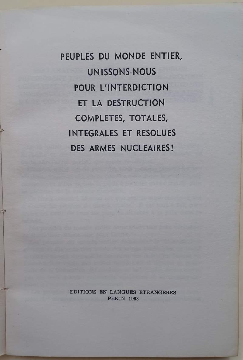 ...ET LA DESTRUCTION COMPLETES, TOTALE, INTEGRALES ET RESOLUES DES ARMES NUCLEAIRES! In 8', br. ed., pp. 229; bruniture e segni del tempo alla cop., interno in buono stato, sottolineatura alla prima pagina. ***Due to bureaucratic reasons, books dated over 70 years old cannot be immediately exported, please contact us before placing the order.***