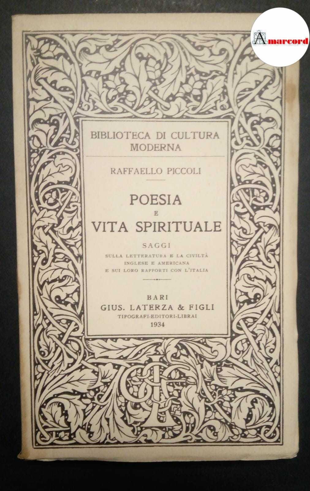Piccoli Raffaello Piccoli Raffaello, Poesia e vita spirituale, Laterza, 1934.. Bari, Laterza 1934 italiano, in ottavo 234 39539