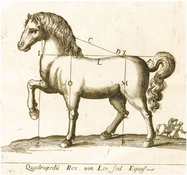 Folio (332 x 218 mm). With engraved frontispiece, portrait of the author, and 140 engravings, all but one full-page. Contemporary full vellum with manuscript lettering to spine. First edition of this rare Italian riding school, covering all aspects of horse breeding, training and care, lavishly illustrated with 140 engravings. A second, enlarged edition, also apparently rare, was published in 1723 under the title "Opera". The work is divided into five parts: the first, "Regole di cavalcare" with one plate; the second, "[.] ove si tratta del difficilissimo mestiere dell' imbrigliare"; the third, "[.] dell' istesso", with 95 illustrations of bits, etc.; the fourth, "Disegni de' circoli" with 10 diagrams and "Ritratti d'uomini illustri" with 27 portraits, about half of which show mounted figures; the fifth, "[.] intorno alla preservativa, conservatione, e medicina per cavalli" with 7 plates, also including other animals (such as a rhinoceros). - Errata leaf at beginning, some leaves browned or spotted. No copy in auction records of the last decades. - Huth p. 28. Brunet I, 159. Graesse I, 68.
