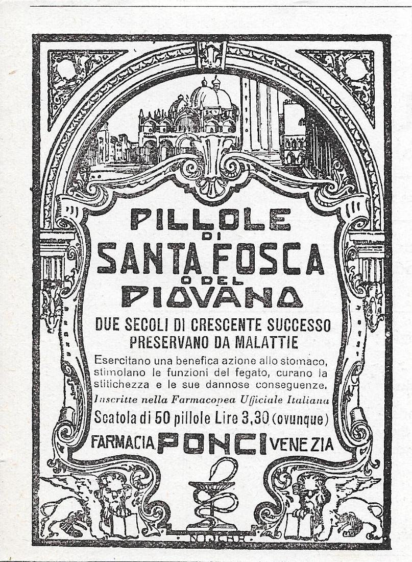 Pillole di Santa Fosca o del Piovano. Farmacia Ponci Venezia. Advertising 1936