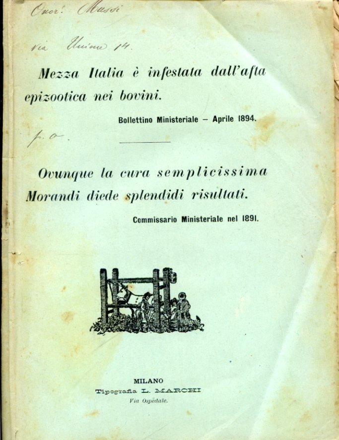 In-8°, pp. 110, brossura editoriale verde acqua con piccola vignetta incisa su legno e invio manoscritto al parlamentare Giuseppe Mussi. Vignetta al frontespizio con pianta di timo, alcune altre vignette xilografiche n.t. Bell'esemplare. Raccolta di documenti e testimonianze sulla cura a base di timo ideata da Luigi Morandi contro l'ata epizootica nei bovini.