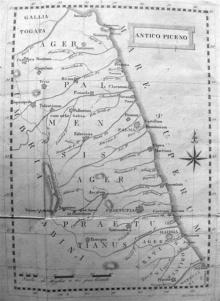 gr. vol. in-4, pp. XX, 303, leg. m. pelle coeva con carta dec, ai piatti. Bella carta topogr. dell'antico Piceno ripiegata in antip. inc. da G.Battista Cipriani. Con un'infinità di antiche iscrizioni commentate. Lozzi 3587. Insieme all'opera sono raccolti 3 opuscoli: 1 - Idem. LETTERA del Reverendissimo Padre. parroco di S. Salvatore in Onda, ed innografo della S. Congregazione dei Riti. sull'antica Alba città de Piceno. Fermo, Paccasassi, 1824, in-8, pp. 16, leg. carta dec. coeva; 2 - [ANTALDI Antaldo]. SULLA EMENDAZIONE proposta dal P. Antonio Brandimarte di un luogo di Plinio Seniore nella descriione del Piceno. Frammento. Pesaro, Nobili, 1823, in-16, pp. 23, senza leg.; 3 - Idem. LETTERA del reverendissimo. al Sig. Abate Francesco Cancellieri. Terza edizione. Roma, Mordacchini, 1818, in-8, pp. VIII, senza leg. [299]