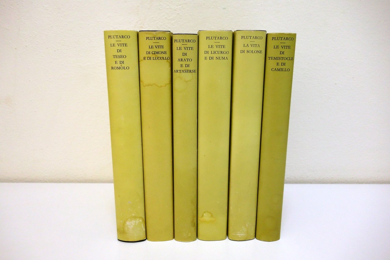 6 voll.; Mondadori (collana Fondazione Valla), Milano, 1983-93; cm 20,5x13; pp. XCII; 364 (vite di Teseo e Romolo); pp. LXXIV; 374 (vite di Cimone e Lucullo); pp. XLVIII; 322 (vite di Arato e di Artaserse); pp. LVIII; 360 (vite di Licurgo e di Numa); pp. LIV; 312 (vita di Solone); pp. LX; 366 (vite di Temistocle e di Camillo); legatura ed. in cartonato con titolo al dorso, sovraccoperta ed. ill. a colori. Sei volumi. Testo originale a fronte.