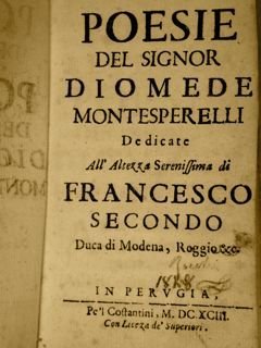 POESIE DEL SIGNOR DIOMEDE MONTESPERELLI dedicate all'Altezza serenissima di Francesco Secondo Duca di Modena, Reggio & c. In Perugia, Pe'l Costantini, 1693.