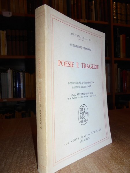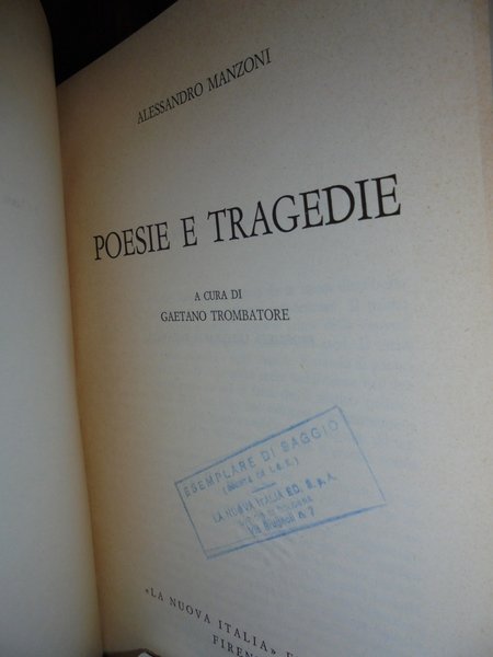 Alessandro Manzoni. Poesie e Tragedie. Prima edizione, Firenze 1970. Introduzione e commento di Gaetano Trombatore. In-8°, br., edit. 417 pp. Timbro di ex possessore in copertina e in frontespizio. Esemplare ben conservato. Neg. lett. ant. mob. 6