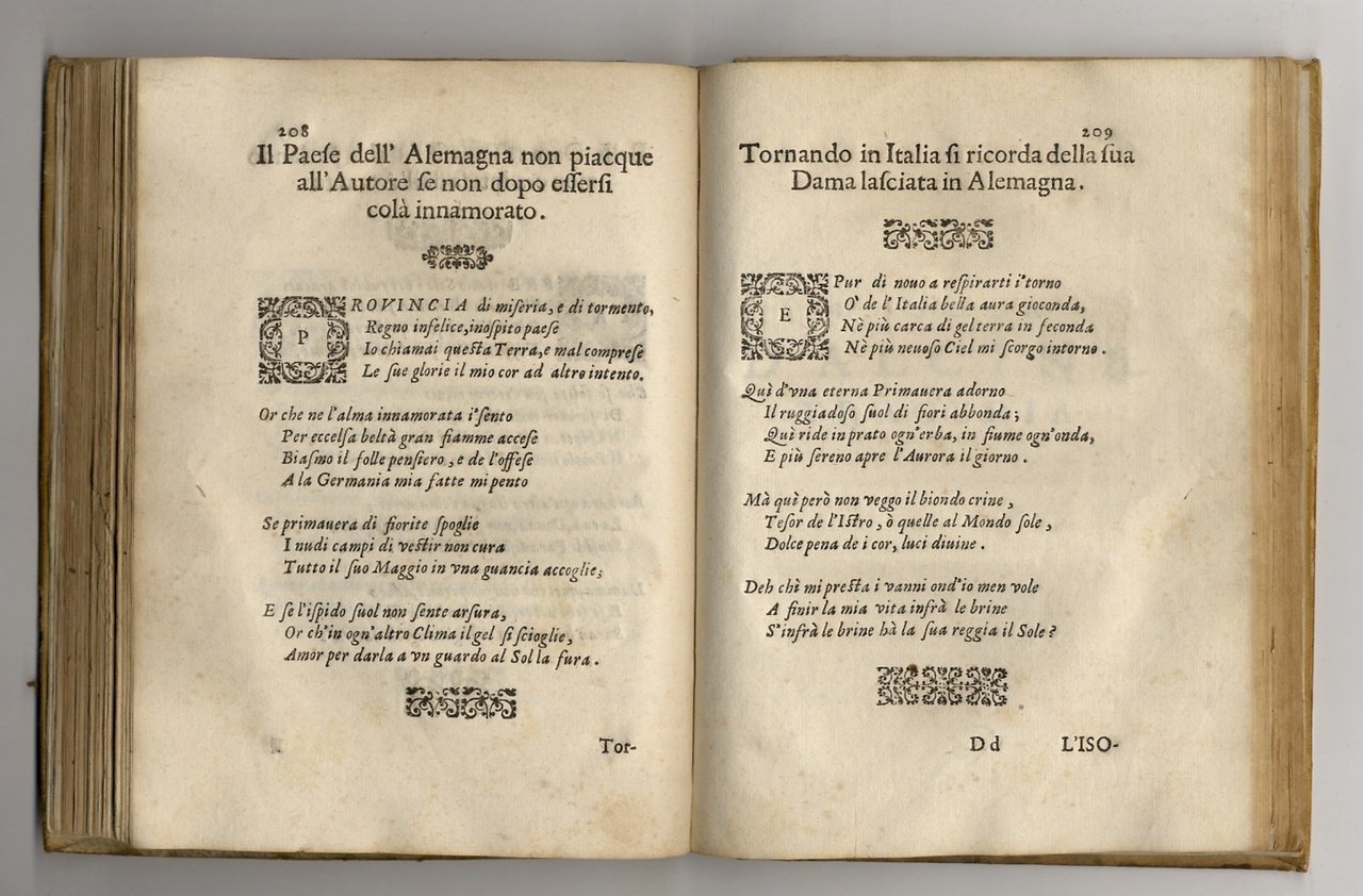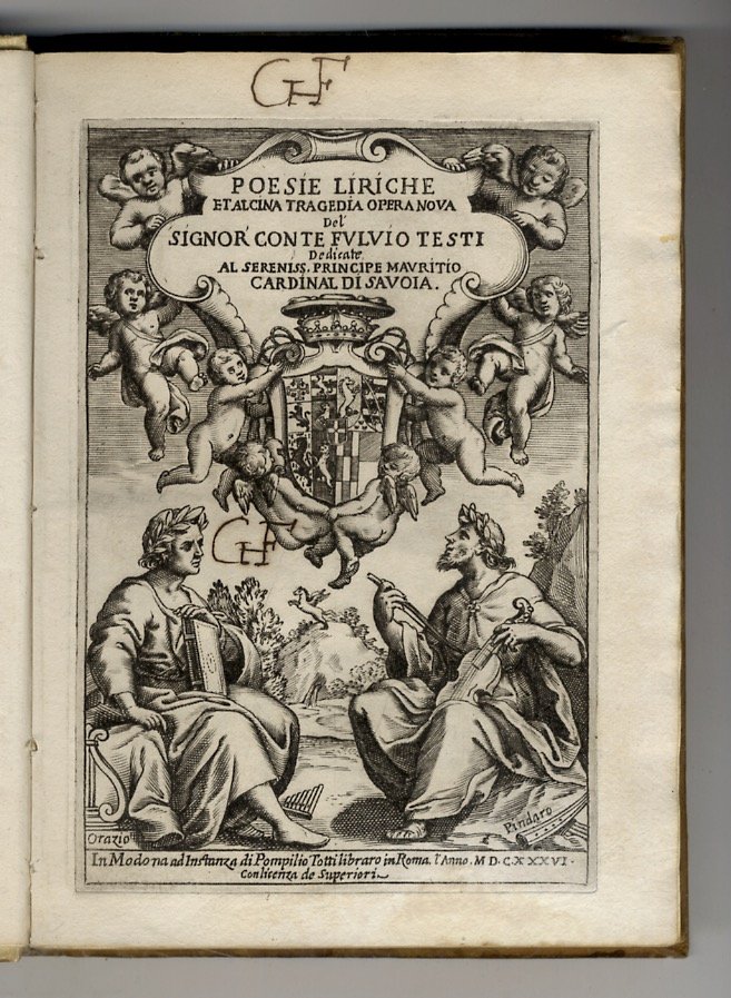 In Modona [ma: Roma], ad instanza di Pompilio Totti libraro in Roma, 1636, in-4, legatura coeva in piena pergamena, pp. [8], 291, [1]. Con un bel frontespizio calcografico fuori fascicolazione (Pindaro e Orazio, stemma del card. Maurizio di Savoia cui l'opera è dedicata). L'ultima pagina reca un colophon (In Modona l'Anno 1636), con una marca editoriale in xilografia (una torre entro cornice figurata). è presente l'occhietto che reca: Poesie liriche del conte don Fulvio Testi. "L'isola d'Alcina tragedia" inizia con proprio occhietto a c. Dd2. Fulvio Testi fu segretario di stato del Duca di Modena Francesco I. Nominato governatore della Garfagnana, fu coinvolto in un intrigo antispagnolo e arrestato. Morì in carcere. La prima edizione delle poesie risale al 1613. Alcune note manoscritte antiche sul contropiatto anteriore fanno riferimento al Chiabrera, che fu uno dei modelli letterari del Testi. Mancano in legacci originali sui piatti, per il resto ottimo esemplare.