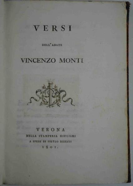 Tre parti in un volume di cm. 19, pp. 159 (1); 96; 59 (5). Graziosi fregi incisi in rame a ciascun frontespizio. Solida ed elegante leg. ottocentesca in mezza pelle, dorso a piccoli nervi con titoli fregi in oro. Esemplare pulito, marginoso e ben conservato. Edizione che ebbe una vicenda tipografica assai complessa, non comune quando completa di tutte le sue tre parti. Lo stampatore veronese Bisesti sembra aver impresso tre diverse edizioni nel 1801, ciascuna con impaginazione differente.