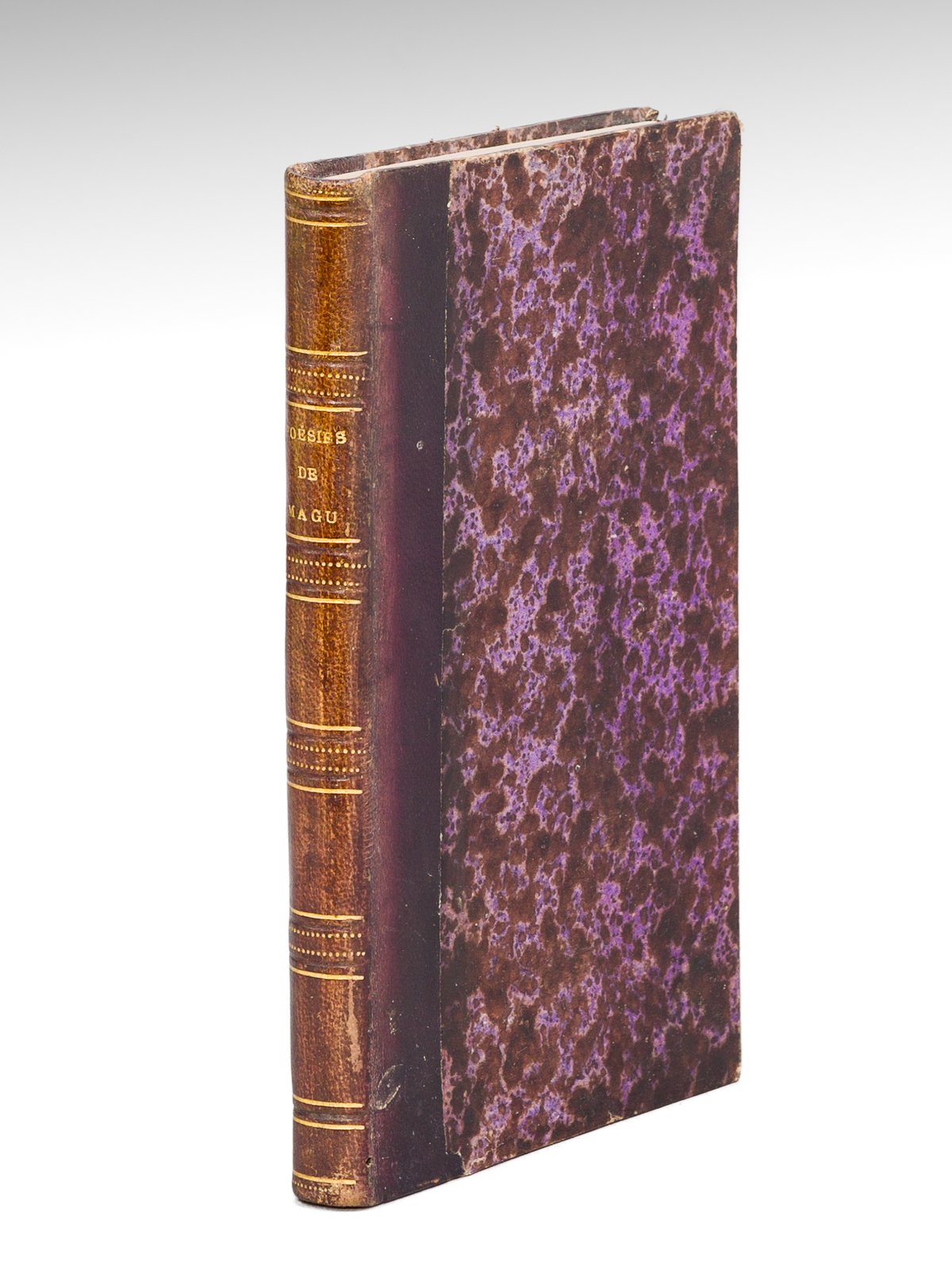 1 vol. in-12 reliure de l'époque demi-basane violine, Chez Delloye, Paris, Chez l'Auteur, Lizy, 1839, portrait en frontispice par Alophe, 2 ff., XX-291 pp. Rare exemplaire de l'édition originale, en reliure d'époque. Marie Eléonore Magu (1788-1860) alterna le travail de tisserand et de forain, et diffusa quelques pièces de vers qui attirèrent l'attention des professeurs du collège de Meaux. Il se fit remarquer en 1838 par un poème adressé au roi à l’occasion de la prise de Constantine, et en 1839 le présent ouvrage fut publié grâce à une souscription qui réunissait toutes les notabilités du département. George Sand vint le féciliter, Béranger le reçut. Sur une recommandation conjointe de ce dernier et de Villemain, il obtiendra du ministère de l’Instruction publique une pension de deux cents francs. Bon état (très petits frott., bon exemplaire par ailleurs, ex-libris en garde). Vicaire, V, 452