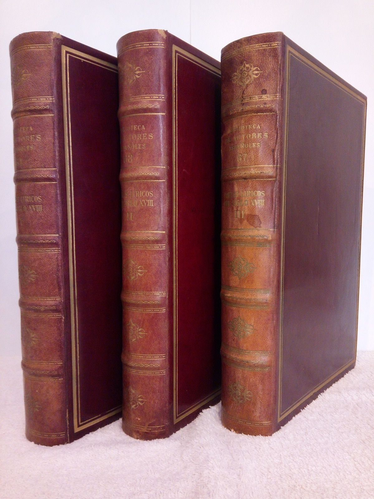 [Edición de lujo].- Madrid: Eds. Atlas, 1952.- 3 VOLS. (CCXXXVII,488 p.; [3 h.], 641 p., [1 h.]; XIV,744 p.); 4º (25,7 x 17,5 cm); Enc. en Plena Piel Ed., lomo cuajado, tapas con plancha dorada recuadrando.- (Biblioteca de Autores Españoles. Nos. 61, 62 y 67).- Edición numerada, siendo este ejemplar el Nº 002.* Solamente los lomos algo descoloridos por la exposición al aire y al Sol. Por lo demás en muy buen estado. SIGLO XVIII ESPAÑOL