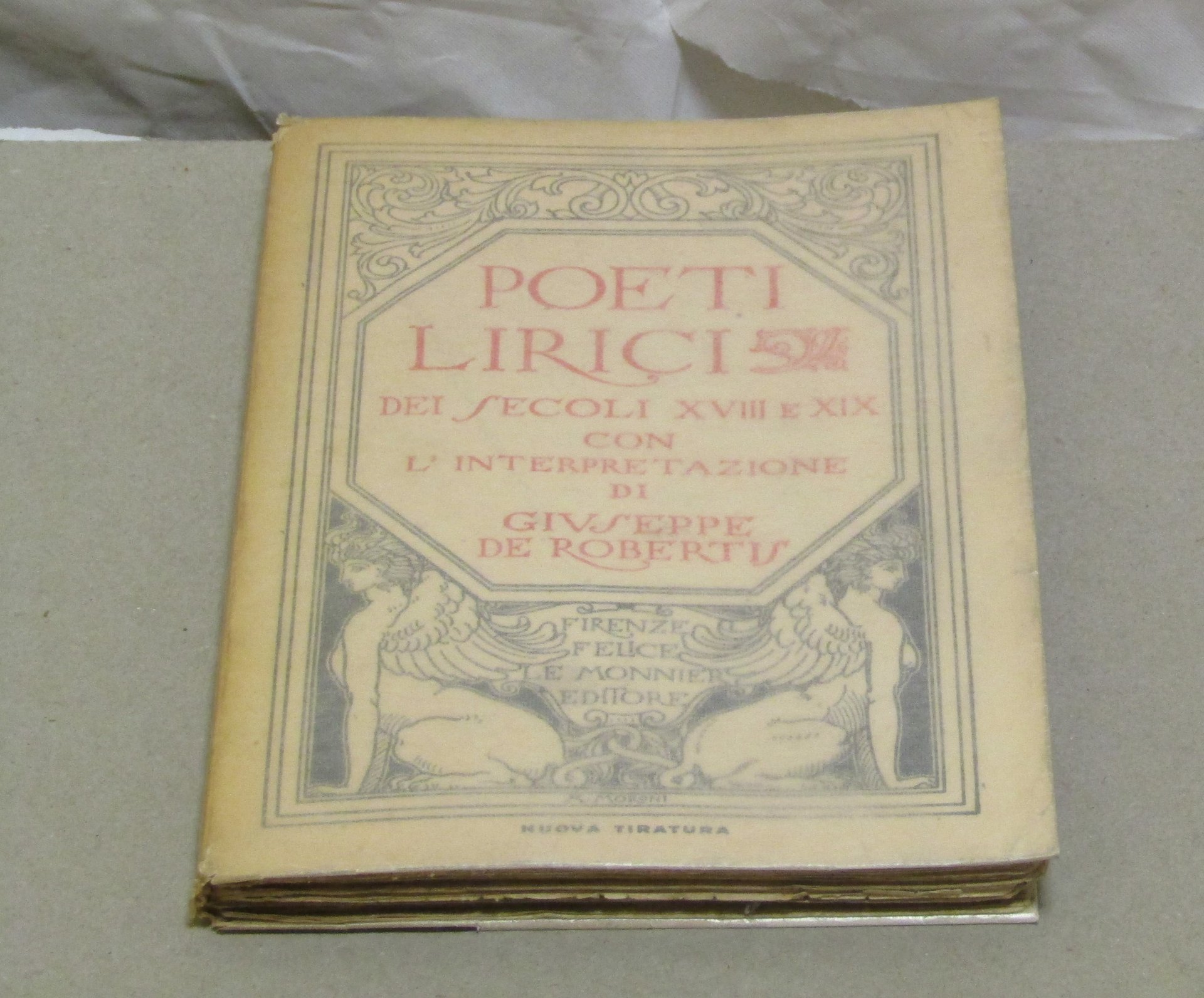 DE ROBERTIS GIUSEPPE (a cura) POETI LIRICI DEI SECOLI XVIII E XIX Con l'interpretazione di G. De Robertis . , LE MONNIER 1925 , In-8 - bross. ill. da A. Moroni - pp. (6) + 242 - pag. non rifilate - velina protettiva - buono