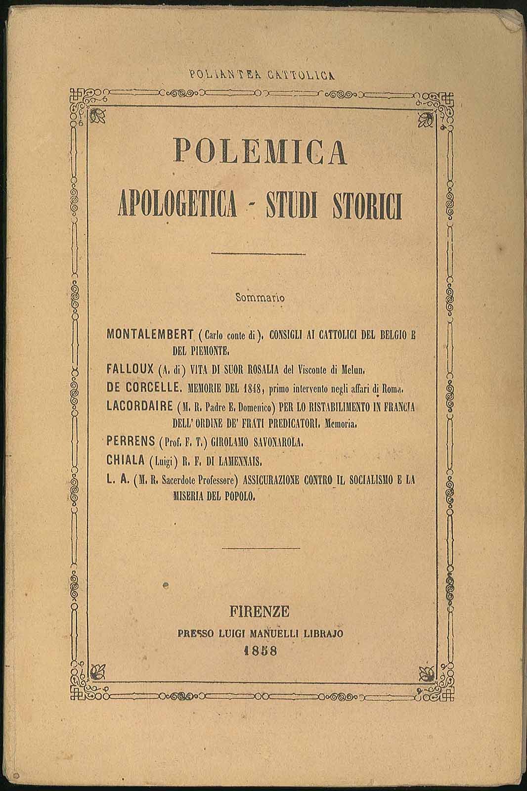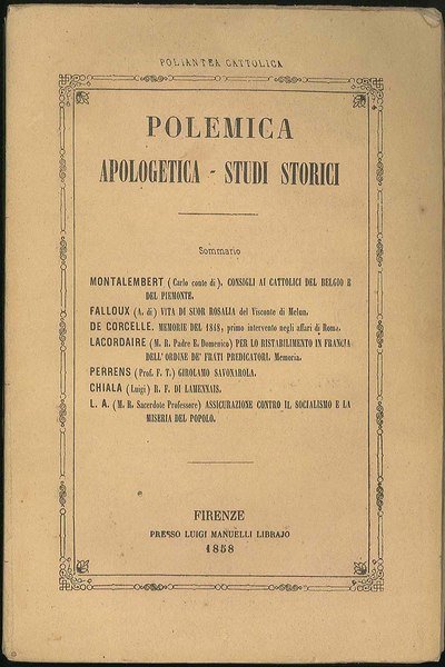 Collana "Poliantea cattolica", volume unico. Gli autori: Montalembert, Falloux, De Corcelle, Perrens, Chiala, L. A. Volume non rifilato. Macchie all'interno e alcuni angoli delle pagine piegati. Usura da scaffale