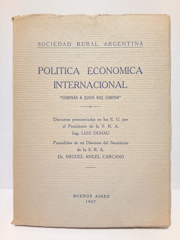 Política Económica Internacional: Comprar a quien nos compra. (Discursos pronunciados en los E. U. por el Presidente de la S. R. A.) / Precedidos de un discurso del Secretario de la S. R. A. Dr. Miguel Angel Carcano | Libri antichi e moderni | Duhau, Luis