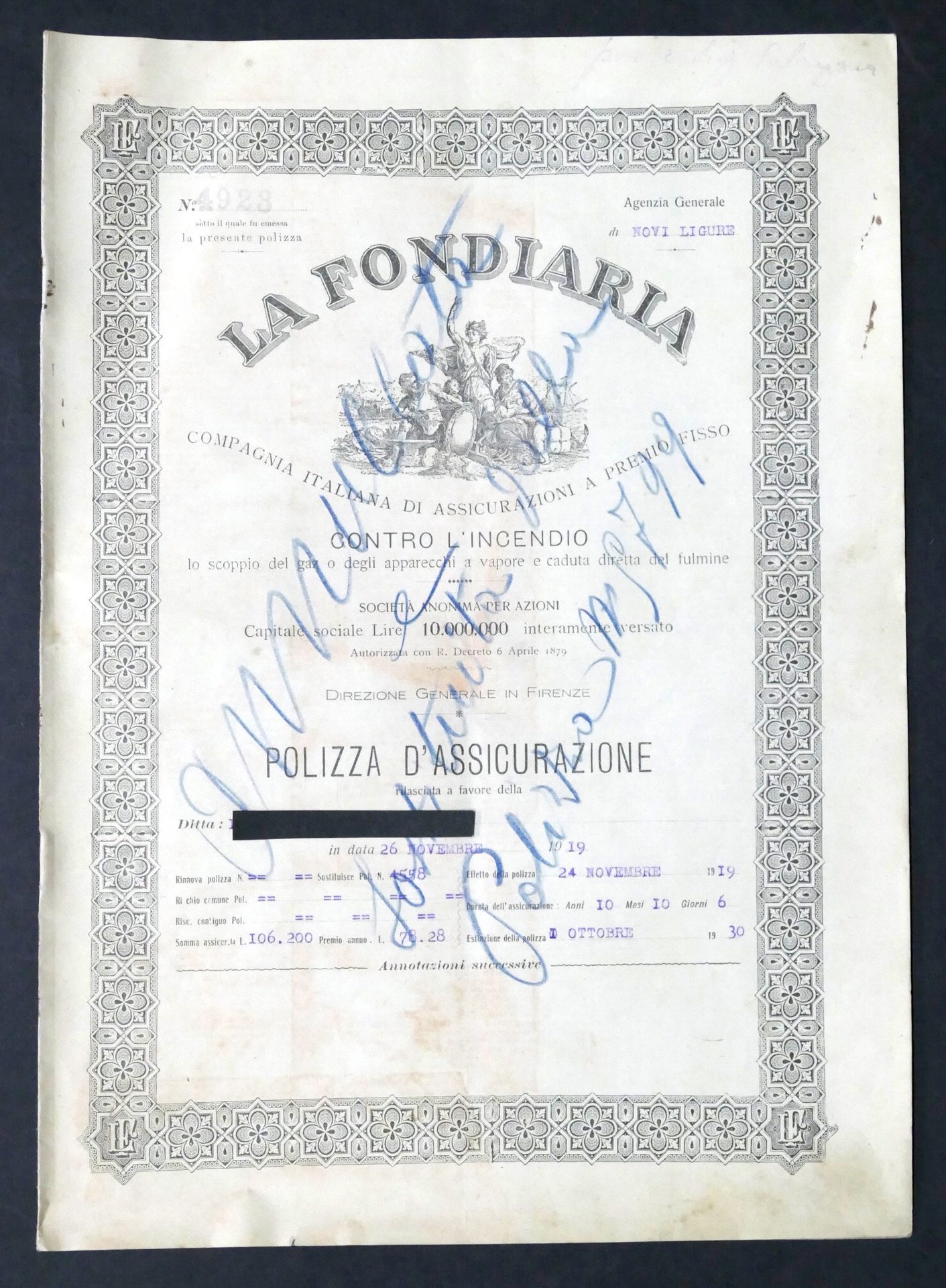 Polizza di Assicurazione contro incendio - La Fondiaria - Ag. Novi Ligure - 1919 | Libri antichi e moderni |