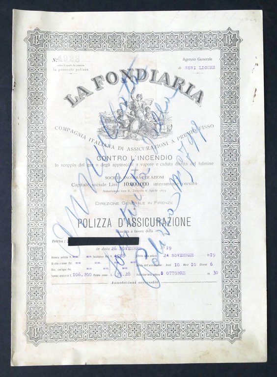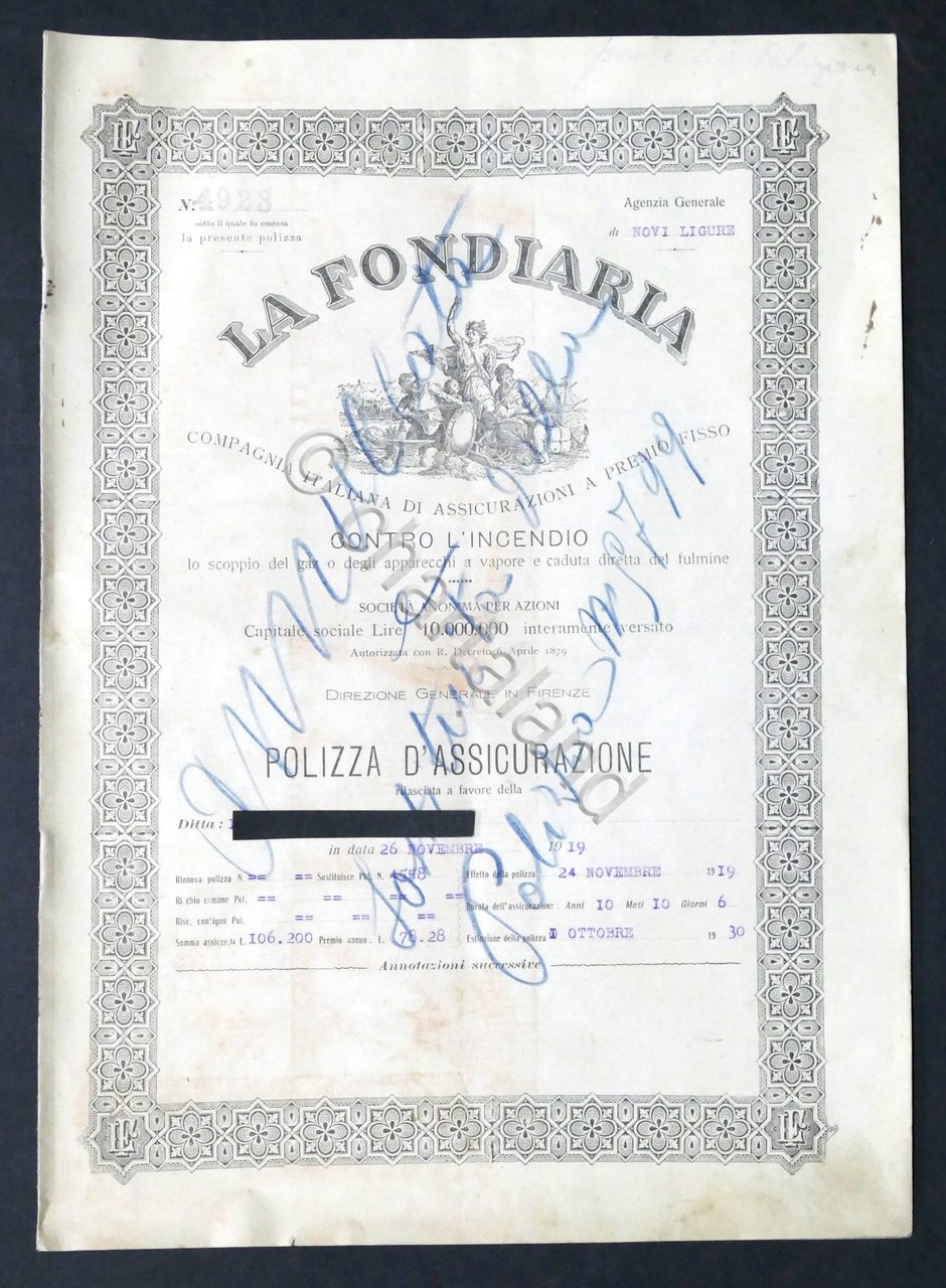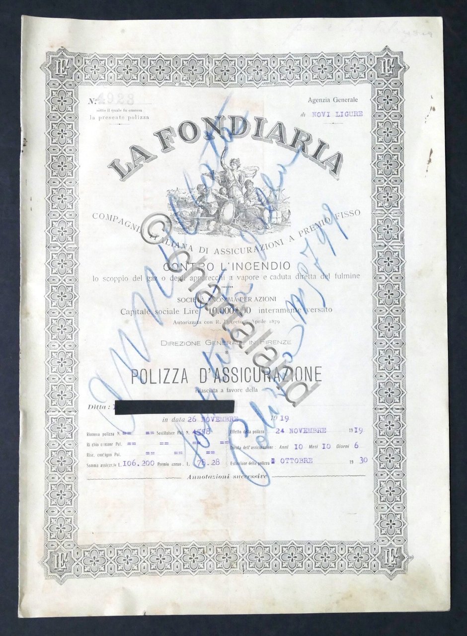 Polizza di Assicurazione contro incendio - La Fondiaria - Ag. Novi Ligure - 1919