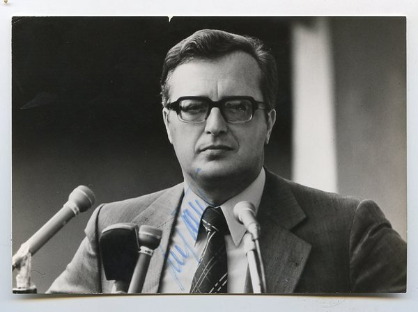 105:147 mm. Portrait en face in S/W. - Josef Taus war von 1975 bis 1979 Bundesparteiobmann der Österreichischen Volkspartei und von 1975 bis 1991 Abgeordneter zum Nationalrat; hernach war und ist er als Unternehmer tätig. - Mit einer winzigen Fehlstelle am oberen Rand.