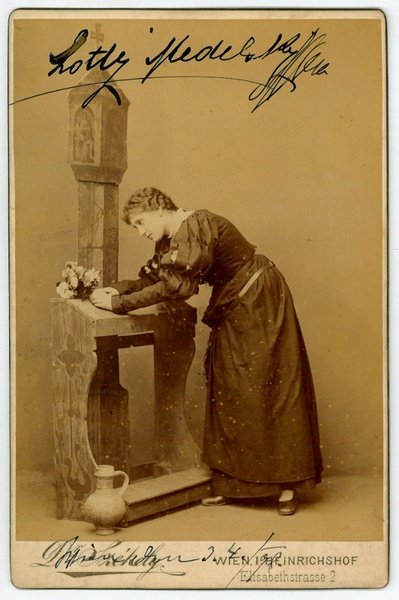165:107 mm. Ganzfigürliche Darstellung der Schauspielerin im Rollenkostüm aus dem Atelier Dr. Székely, Wien, mit dessen gedr. Signet am unteren Rand des Trägerkartons. Mit Signatur am oberen Rand der Bildseite.