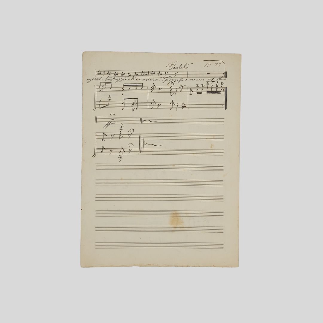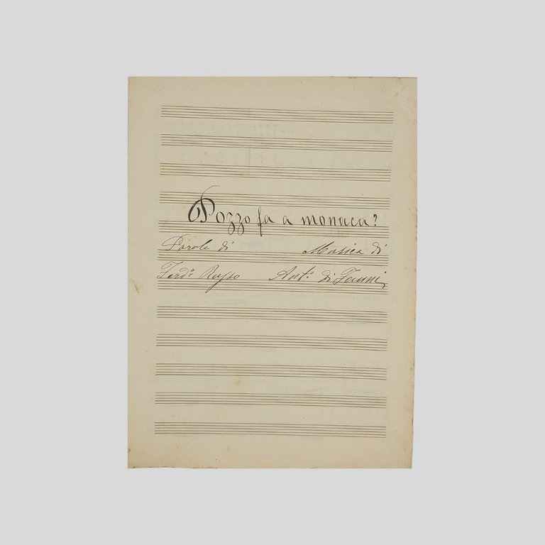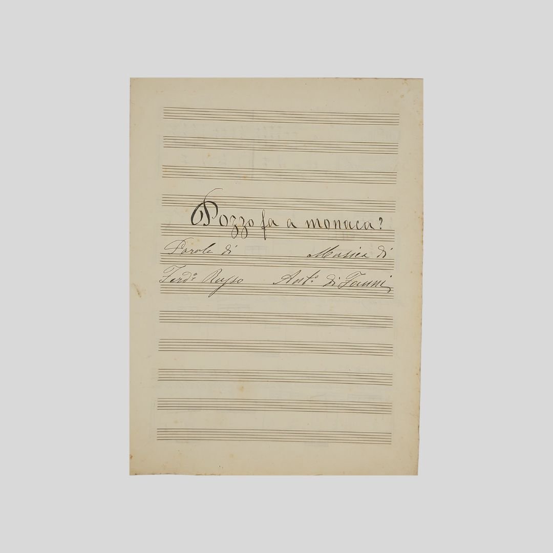 Spartito musicale s.d. (primi ‘900), bifolio manoscritto in chiara grafia su quattro pagine, con inchiostro nero, cm 23,5×31. Non comune. Di Janni in risposta alla macchietta “Pozzo fa ‘o prevete” di Valente e Russo interpretata e commissionata da Nicola Maldacea. "La pratica fine ottocentesca delle “risposte” meriterebbe probabilmente un’analisi approfondita[…]. Sappiamo, ad esempio, che il testo di Pozzo fa ‘a monaca, pubblicata nel Canzoniere Popolare ed evidentemente relativa a Pozzo fa ‘o prevete di Russo e Valente, fu commissionato da Di ]anni, il primo musicista incaricato da Nicola Maldacea di musicare la macchietta di Russo. Egli, piccato nel vedersi preferito Valente, intese in tal modo esprimere il suo disappunto […]».
