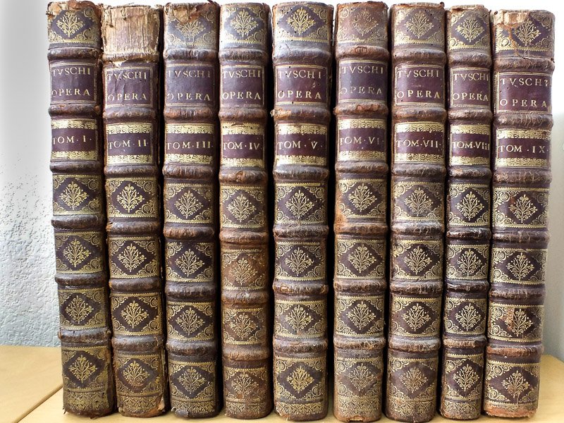 Practicarum conclusionum Iuris, in omni foro frequentiorum (9 Tomes - Complet) In quibus Praeter Spirituales, Ecclesiasticas, Legales, Iudiciarias caetera?sque materias Canonicas, Prophanas, Civiles, Criminales & mixtas in vtroque foro magis frequentes, miro ordine digestas recepta?sque opiniones vbique Asterisco * notatis aliqua multarum insignium ecclesiarum, ordinum regularium militiarum regnorum prouinciarum ciuitatum & aliorum locorum statua mores consuetudines, indulta & priuilegia vt obiter a doctoribus citatis sunt relata ordine alphabetico contineuntur ac declarantur. Opus omnibus iudicibus ciuilibus et criminalibus tam ecclesiasticuis quam secularibus ac praecipue palatis aduocatis causorum patronis & vtriusque iuris peritis | Libri antichi e moderni | Tuscus, Dominicus, [ Toschi, Domenico, Toschi, Carlo]