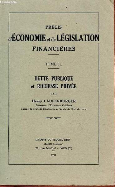 PRECIS D'ECONOMIE ET DE LEGISLATION FINANCIERES / TOME II : DETTES PUBLIQUE ET RICHESSE PRIVEE. | Libri antichi e moderni | Laufenburger Henry
