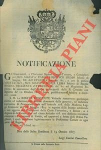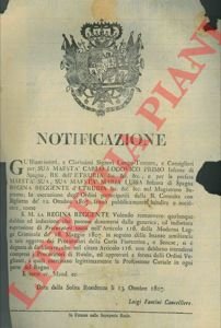 Firenze, 1807, 13 ottobre, Notificazione di cm. 26 x 38 con grande stemma reale xil. (Carlo Lodovico I° e Maria Luisa Regina Reggente d'Etruria). Strappo ad un lato con mancanza di carta bianca.