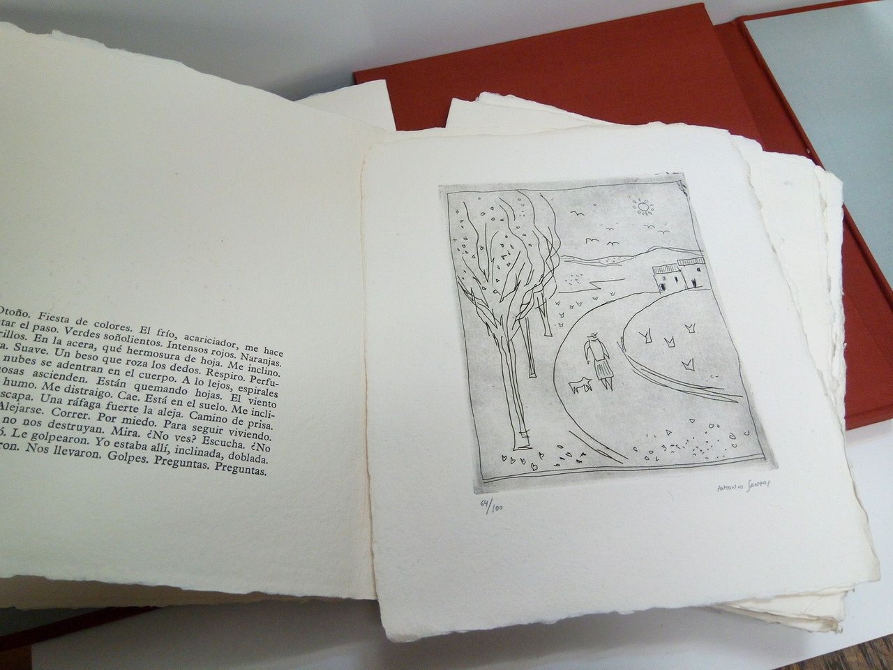 [PRIMERA EDICION LIMITADA].- Madrid: Ed. Almarabú, 1985.- [18 h., 3 de ellas en blanco, las 2 primeras y la última]: Ilustrado con 6 preciosos aguafuertes firmados a lápiz por Antonio Santos; 4º mayor (27 x 23 cm); Magnífica y cuidada impresión sobre grueso papel hecho a mano, conservando todas sus barbas; Los pliegos sueltos sin coser en una Carpeta en Tela Ed.- Edición de 100 ejemplares. Incluye 6 aguafuertes de Antonio Santos, firmados y numerados. El papel lo ha hecho a mano Segundo Santos, en Cuenca. La tipografía, en caracteres Plantin, es de Anglofort. Lo imprimió José Manuel Furones y la edición ha sido dirigida por Julio Ollero, de Ediciones Almarabú.- RARISIMA EDICION.* En impecable estado. LITERATURA, ESTUDIOS LITERARIOS, FILOSOFÍA Y PENSAMIENTO IBEROAMERICANO EN GENERAL