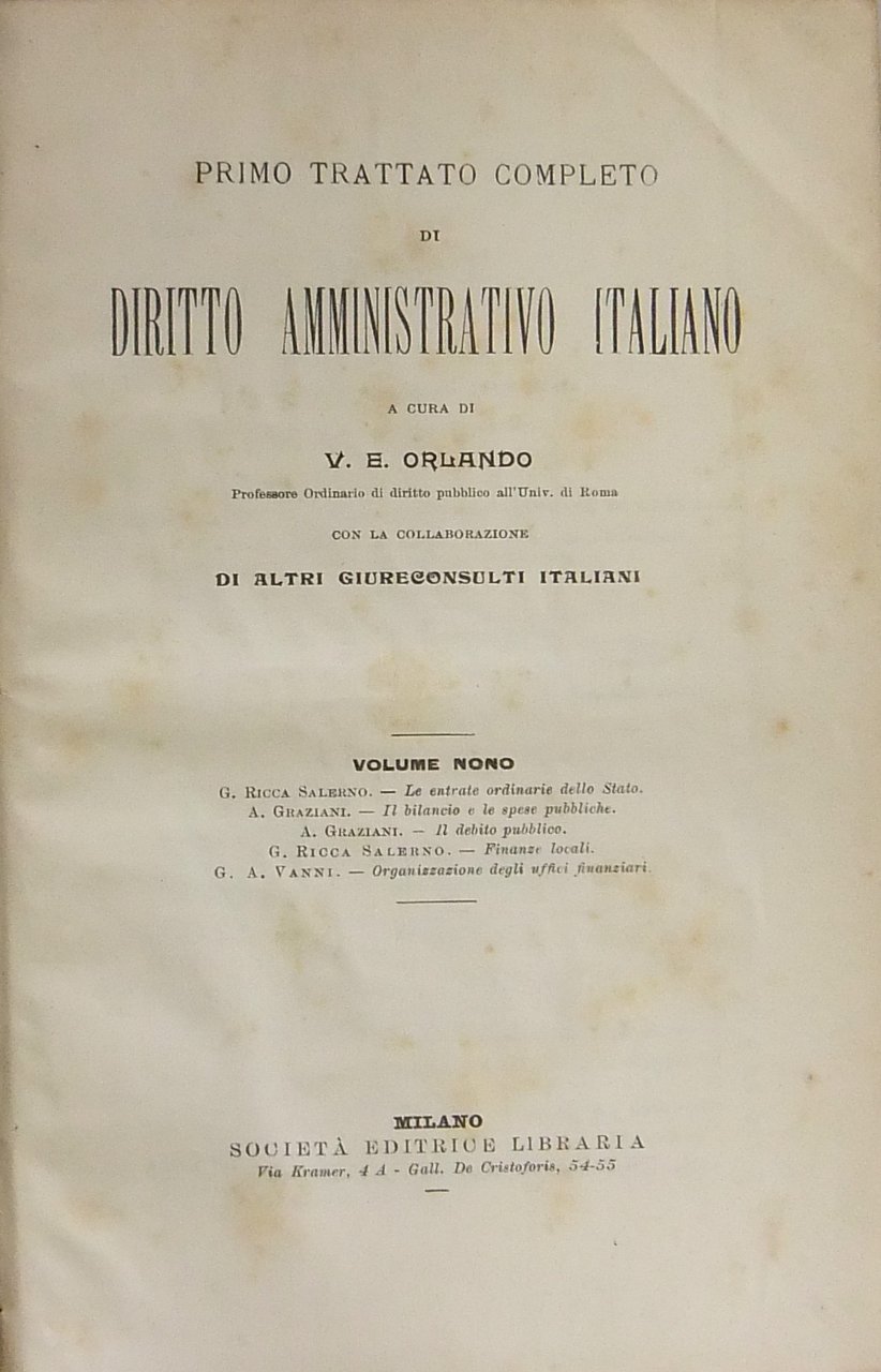 Primo trattato completo di diritto amministrativo italiano. Con la collaborazione di altri giureconsulti italiani. Vol. IX - G. Ricca Salerno: Le entrate ordinarie dello Stato. A. Graziani: Il bilancio e le spese pubbliche. A. Graziani: Il debito pubblico. G. Ricca Salerno: Finanze locali. G.A. Vanni: Organizzazione degli uffici finanziari | Libri antichi e moderni | Orlando Vittorio Emanuele (A C. Di), Orlando Vittorio Emanuele