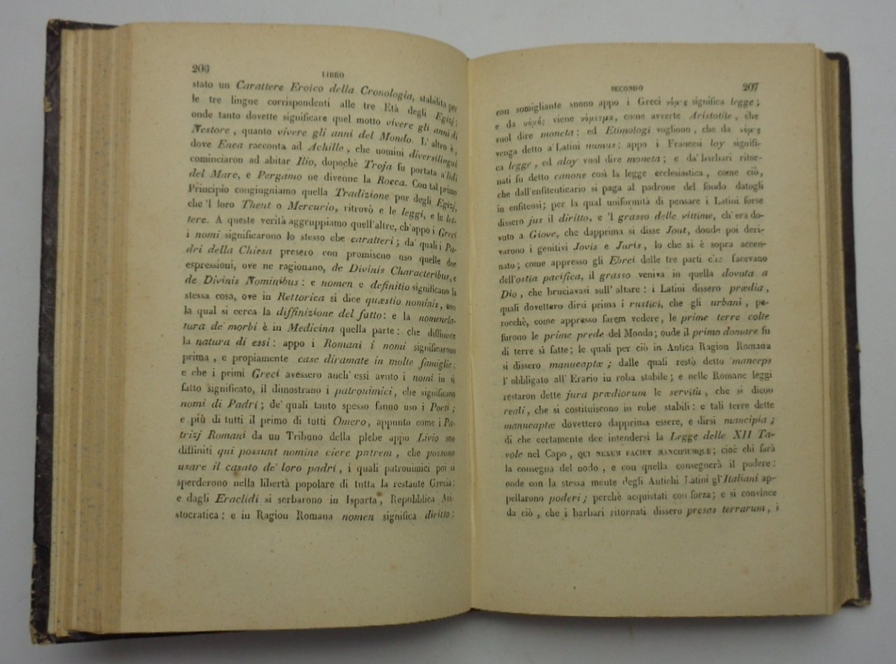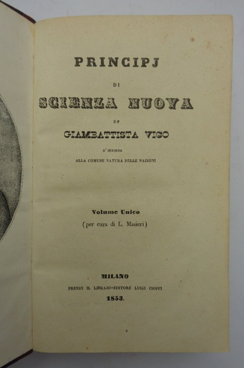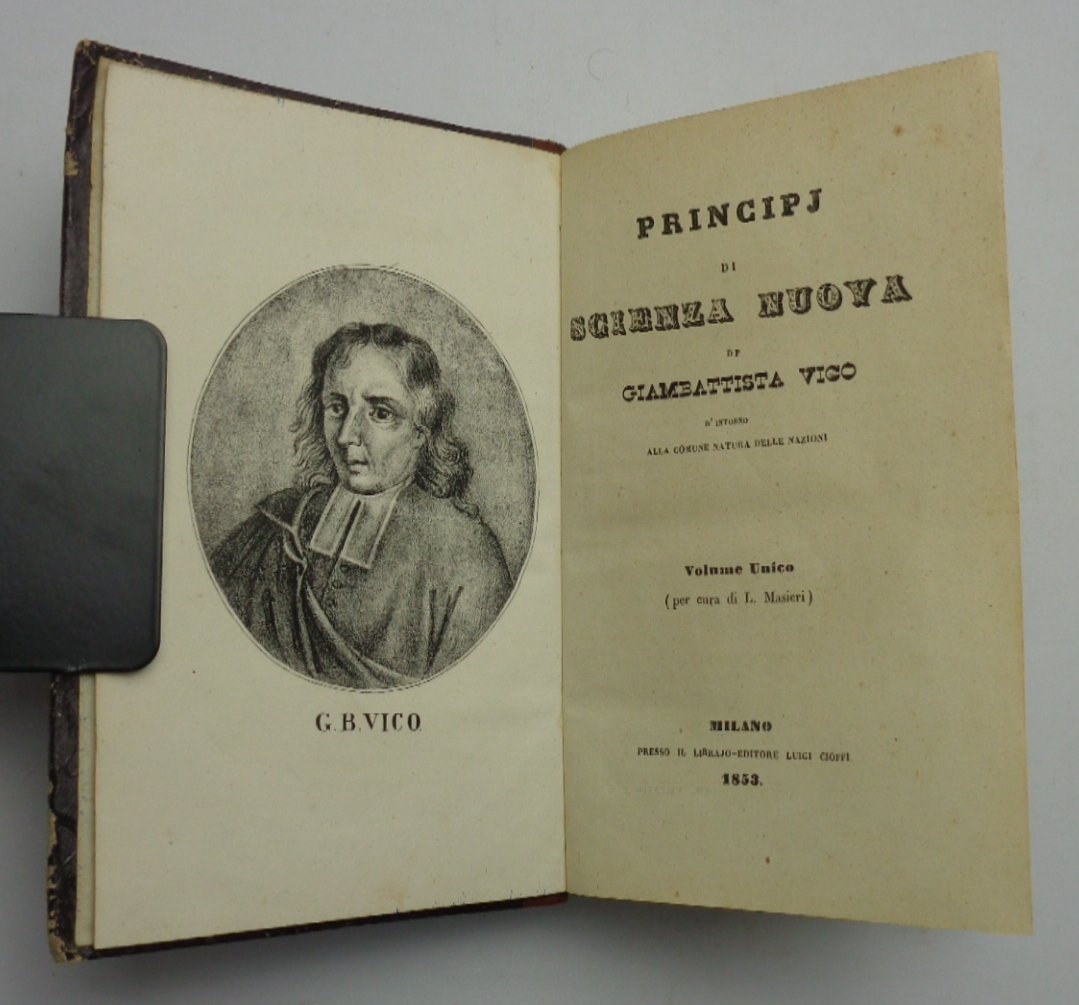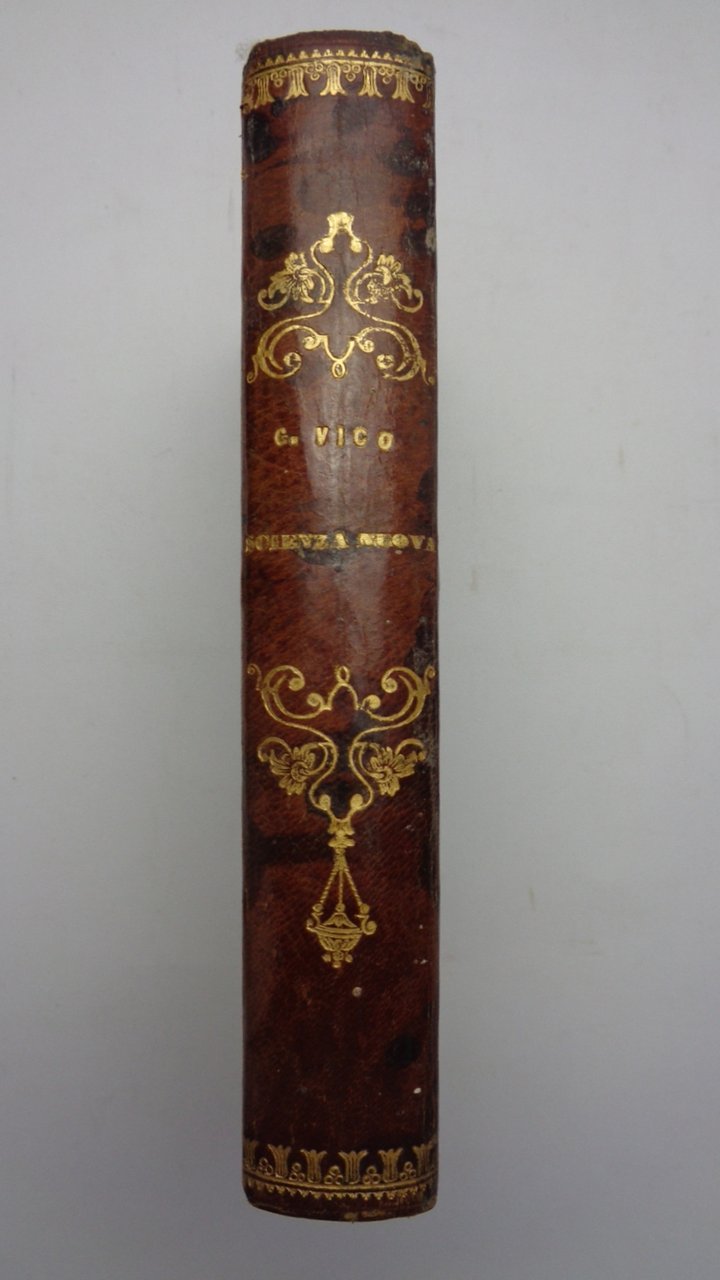 Un volume (11x18 cm) di 607 pagine. Ritratto inciso in antiporta di Vico; incisione ft del frontespizio dell'edizione del 1744; una tavola-schema più volte ripiegata. Legatura coeva in mezza pelle; dorso liscio ornato e dorato, una macchia al piatto anteriore. Ottime condizioni interne. Volume unico, per cura di L. Masieri.