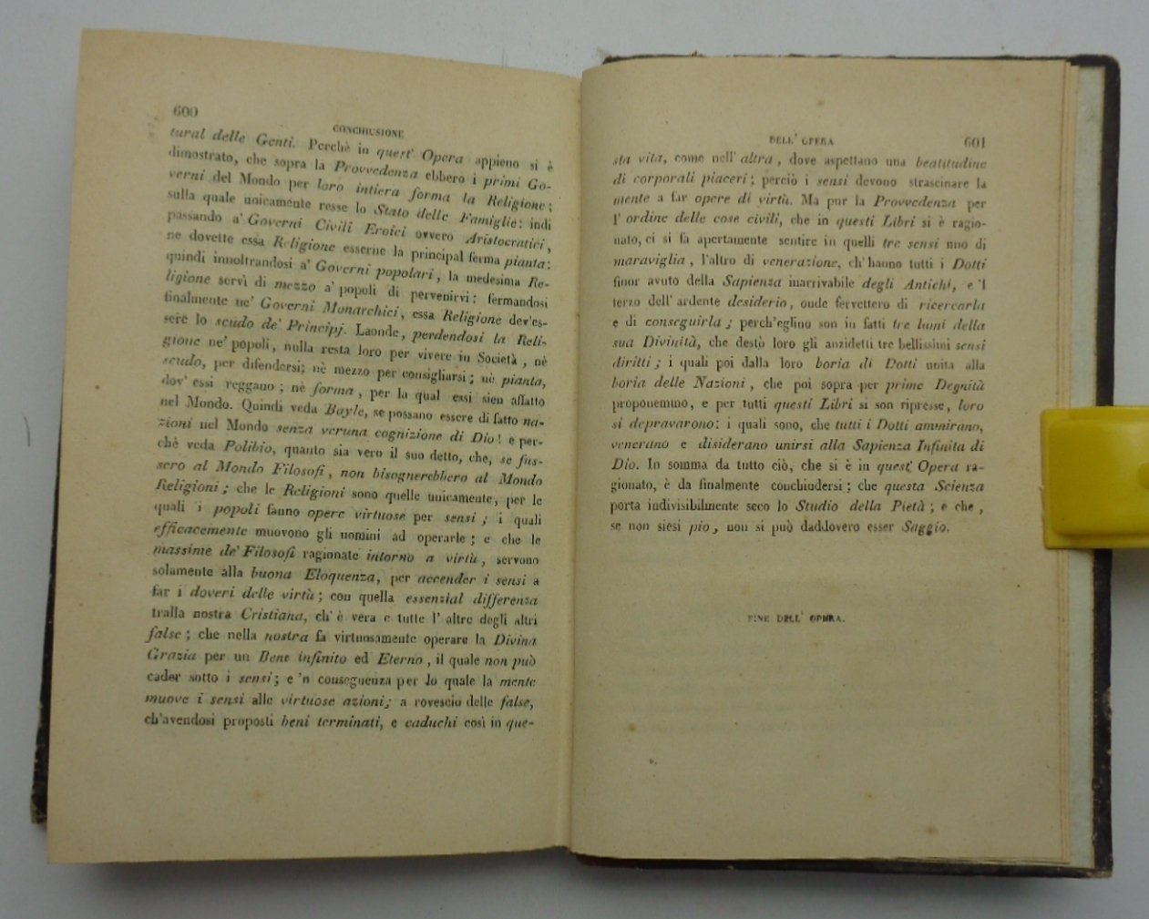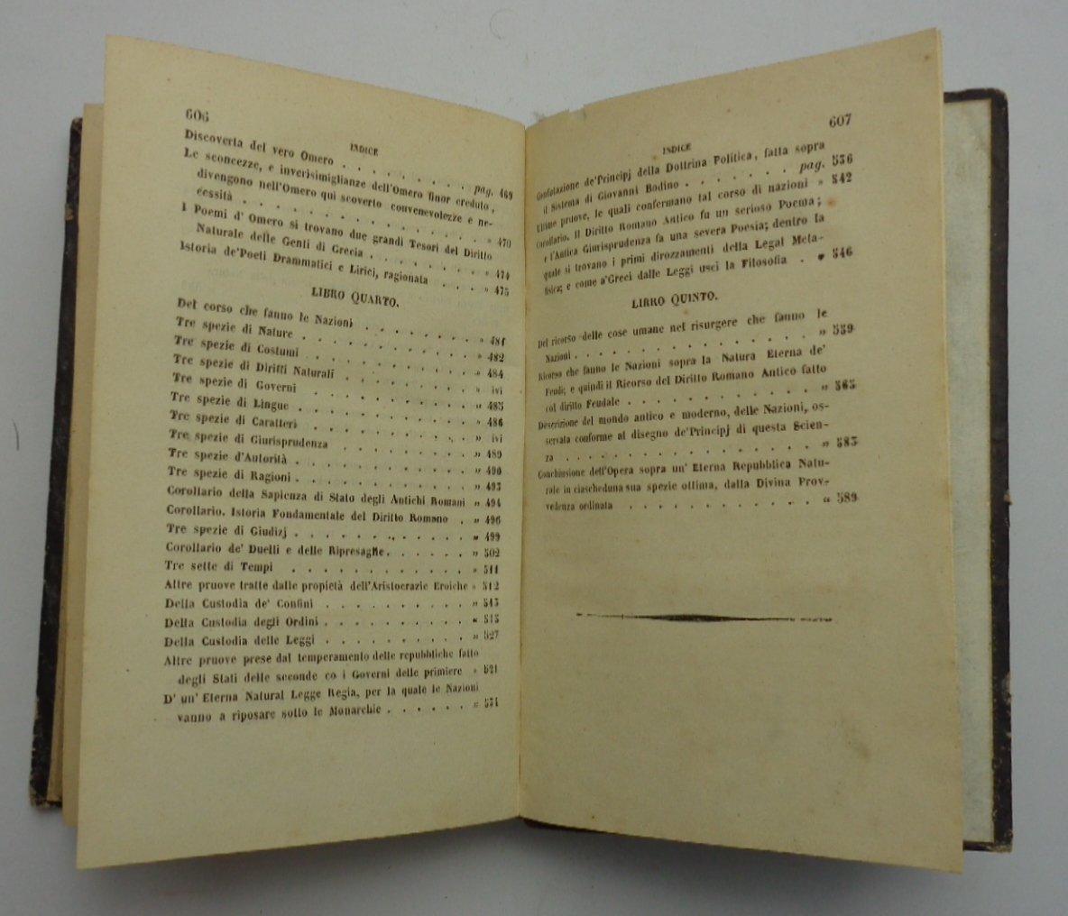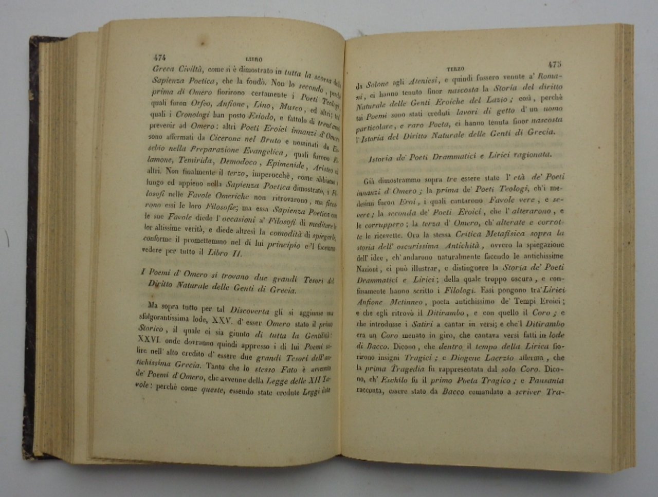 Un volume (11x18 cm) di 607 pagine. Ritratto inciso in antiporta di Vico; incisione ft del frontespizio dell'edizione del 1744; una tavola-schema più volte ripiegata. Legatura coeva in mezza pelle; dorso liscio ornato e dorato, una macchia al piatto anteriore. Ottime condizioni interne. Volume unico, per cura di L. Masieri.
