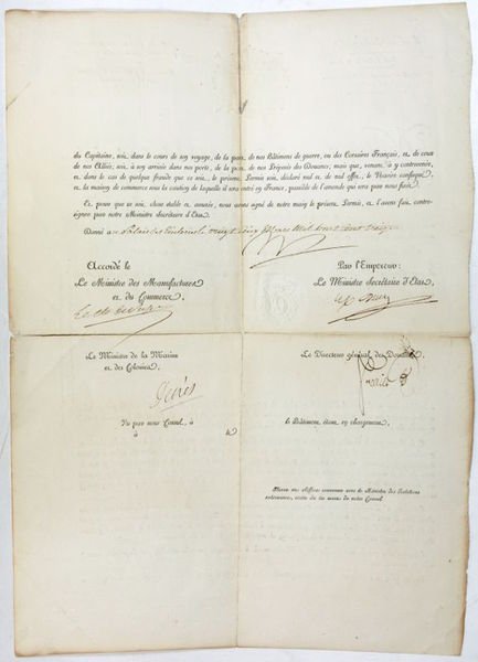 490 x 350 mm. Blank form. Naval patent for an unidentified American ship, counter-signed by trade secretary Jean-Baptiste Henry Collin (1776-1837), state secretary Pierre Antoine Noël Bruno comte Daru (1767-1829), naval secretary Denis Decrès (1761-1820), and the director general of customs. Fine document from the age of the Napoleonic Wars, when the English army had occupied the Iberian Peninsula, fighting against Napoléon's troops, and field marshal Wellington was about to commence his final (and ultimately successful) attack. The present letter patent was issued by the French consul in Charlestown, New York, Boston or Baltimore and permitted American ships to move more or less freely toward France. The British warships were blocking the U.S. ports and obstructing American trade with France - one of the causes for the War of 1812, not resolved until December 1814. - Large reinforced tears to folds; slight edge damage, otherwise in good condition. Left edge trimmed, touching the printed text of the counter-leaf.