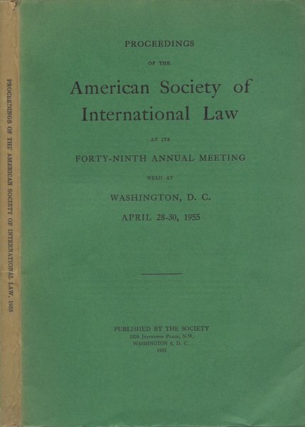 Coperta imbrunita al dorso e lievemente segnata da fattore tempo alle cuffie, tagli e pagine con minima naturale imbrunitura, testo completamente fruibile, contenente gli Atti della Società Americana di Diritto Internazionale alla sua quarantanovesima riunione annuale tenutasi a Washington nel periodo 28-30 aprile 1955, numero pagine 200 (XXVII, 173)