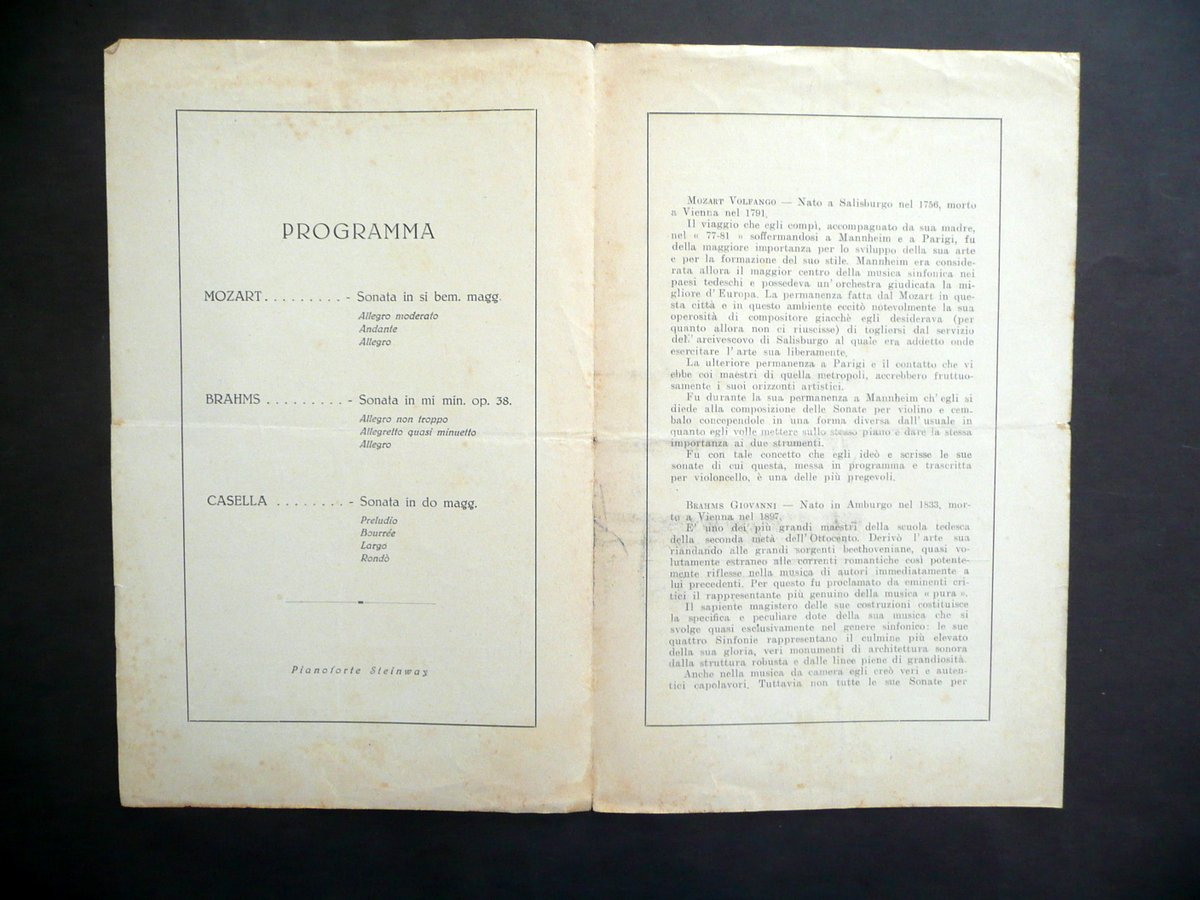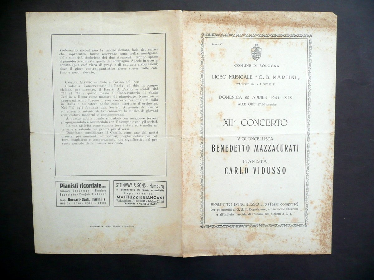 Programma, Comune di Bologna Liceo Musicale G. B. Martini Stagione 1941 Domenica 20 aprile 1941 alle ore 17,30 precise XII° Concerto Violoncellista Benedetto Mazzacurati Pianista Carlo Vidusso Tipografia Luigi Parma, Bologna 1941; programma a stampa su bifolio in carta; cm 22,5x14. Condizioni di conservazione Esemplare ben conservato con tracce d'uso, leggera piega centrale di conservazione, alcune bruniture prevalentemente alla prima facciata. SC03.D12987 N