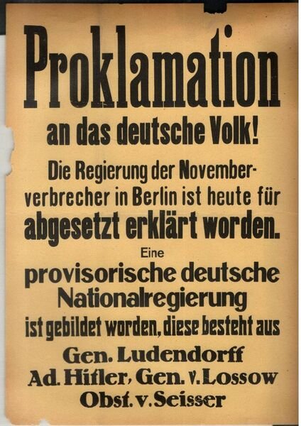 Proklamation an das deutsche Volk!: die Regierung der Novemberverbrecher in Berlin ist heute fr abgesetzt erklrt worden ; eine provisorische deutsche National-Regierung ist gebildet worden ; diese besteht aus General Ludendorff, Adolf Hitler, General von Lossow, Oberst von Seisser. Volantino con la proclamazione del 9 Novembre 1923, durante il tentato Putsch di Monaco | Libri antichi e moderni | Ludendorff, Gen. - Hitler, Ad. - V, Lossow, Gen. - V. Seisser, O, Bst.