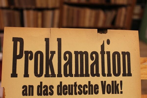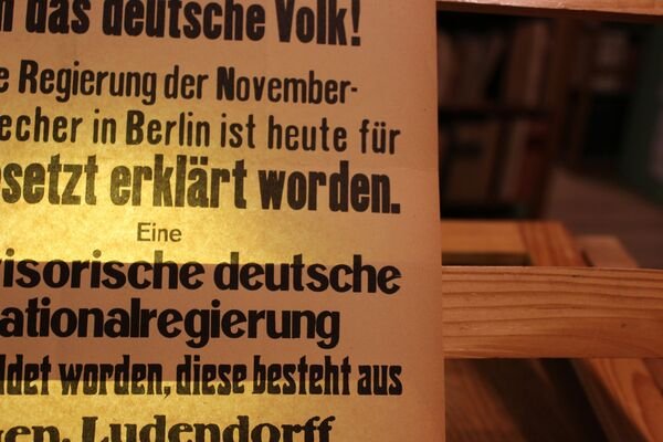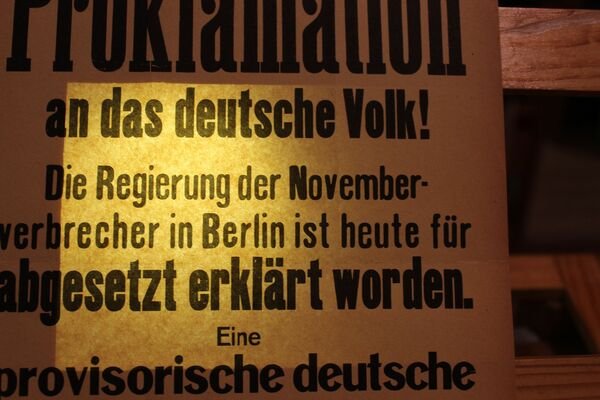 Cm 28,5 x 20. Carta fragile, con bordi ingialliti e con mancanze. Volantino con la proclamazione del 9 Novembre 1923, durante il tentato Putsch di Monaco: 'il governo dei criminali di novembre a berlino stato dichiarato deposto oggi.'.