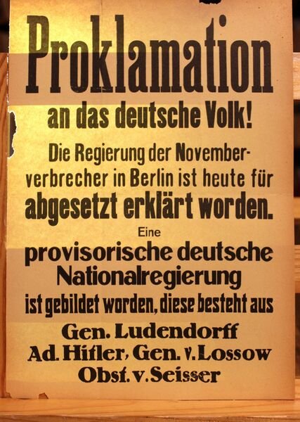 Proklamation an das deutsche Volk!: die Regierung der Novemberverbrecher in Berlin ist heute fr abgesetzt erklrt worden ; eine provisorische deutsche National-Regierung ist gebildet worden ; diese besteht aus General Ludendorff, Adolf Hitler, General von Lossow, Oberst von Seisser. Volantino con la proclamazione del 9 Novembre 1923, durante il tentato Putsch di Monaco
