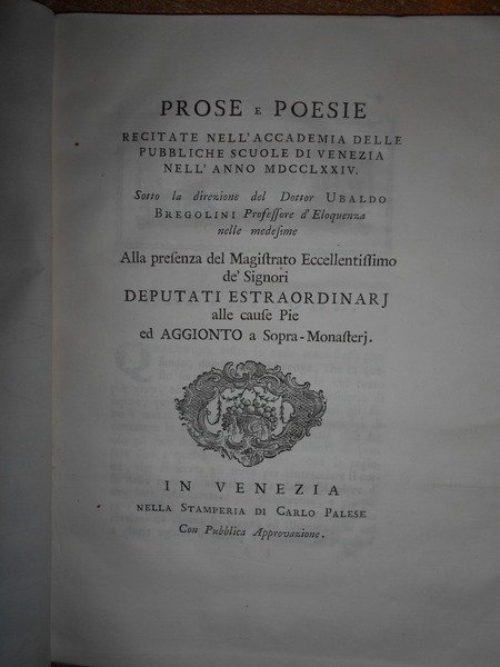 PROSE E POESIE RECITATE NELL' ACCADEMIA DELLE PUBBLICHE SCUOLE DI VENEZIA NELL' ANNO 1774, SOTTO LA DIREZIONE DI UBALDO BREGOLINI, PROFESSORE DI ELOQUENZA NELLE MEDESIME. BREGOLINI, Ubaldo, curante, 1722-1807.