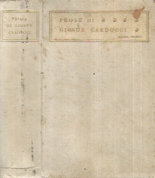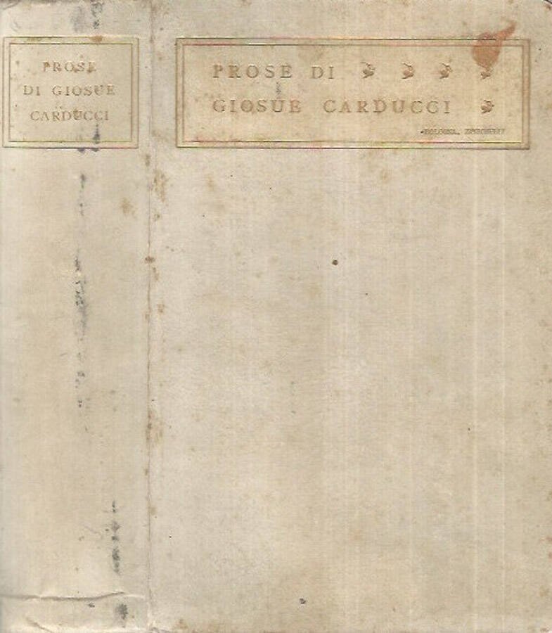 Prose di Giosuè Carducci, quarta edizione del 1909 in volume rilegato con copertina chiara, leggermente puntinata. All'interno le pagine sono candide, ma il taglio, la guardia e la controguardia sono puntinati. numero pagine 1485
