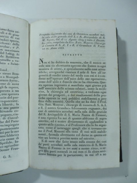 In 8, cm 13 x 20, pp. 8 (da p. 19 a p. 26). Estratto da questo prospetto statistico compilato da G. B. Mazzoni sulla casistica dei parti avvenuti nell'Arcispedale di S. M. Nuova nel triennio 1829 - 1832.