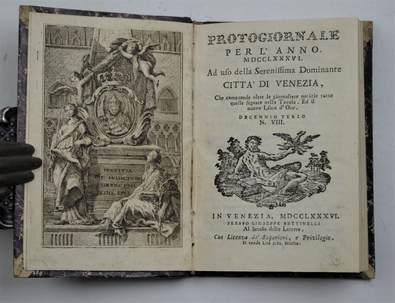 Protogiornale per l'anno bissestile 1786 ad uso della Serenissima dominante città di Venezia, che comprende, oltre le giornaliere notizie, tutte quelle segnate nella Tavola, ed il nuovo Libro d'Oro. Decennio terzo n. VIII.