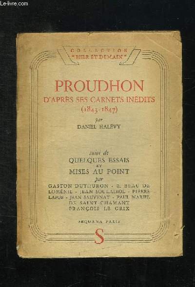 PROUDHON D APRES SES CARNETS INEDITS 1843 - 1847. SUIVIE DE QUELQUES ESSAIS ET MISES AU POINT. | Libri antichi e moderni | Halevy Daniel.