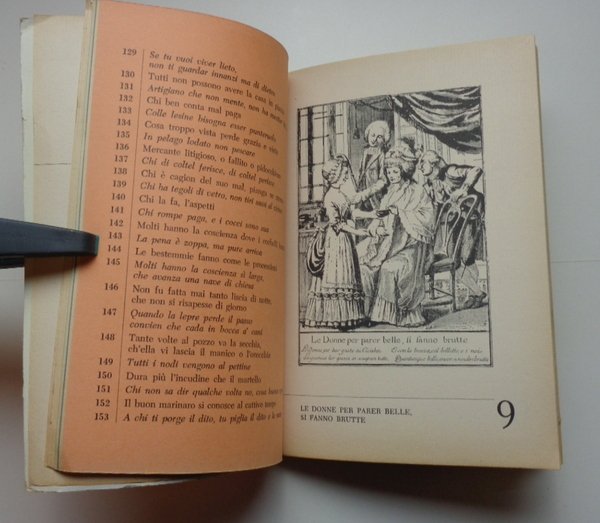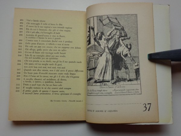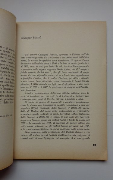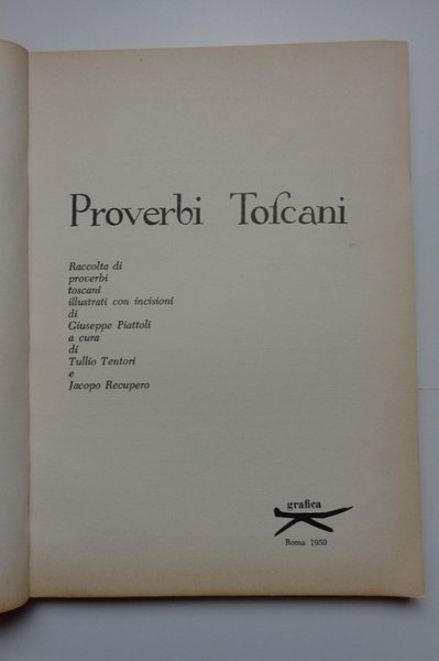 Collana "Cultura e società", 1. Un volume di 16(-100) pagine, brossura editoriale illustrata. Dimensioni: 15x21 cm. Minime tracce d'uso. Raccolta di 513 proverbi toscani illustrati con 40 incisioni di Giuseppe Piattoli.