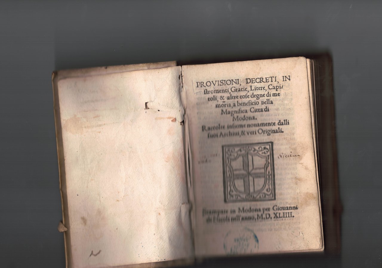 Provisioni, Decreti, Instromenti, Gratie, Litere, Capitoli, et altre cose degne di memoria, a beneficio della Magnifica Città di Modona. Raccolta insieme novamente dalli suoi archivi, et veri Originali.
