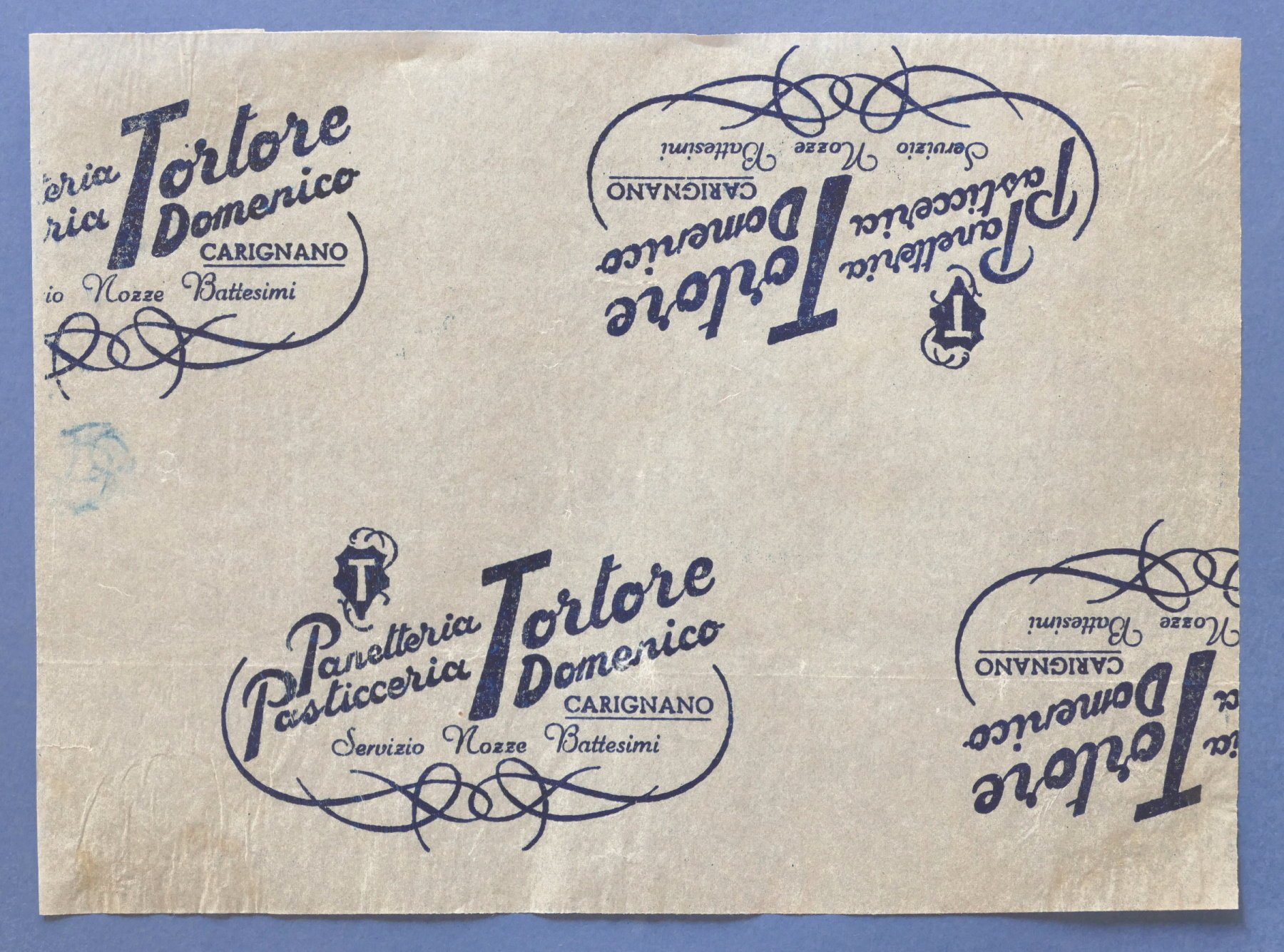 Pubblicità Carta confezione epoca Panetteria Pasticceria Tortore Carignano