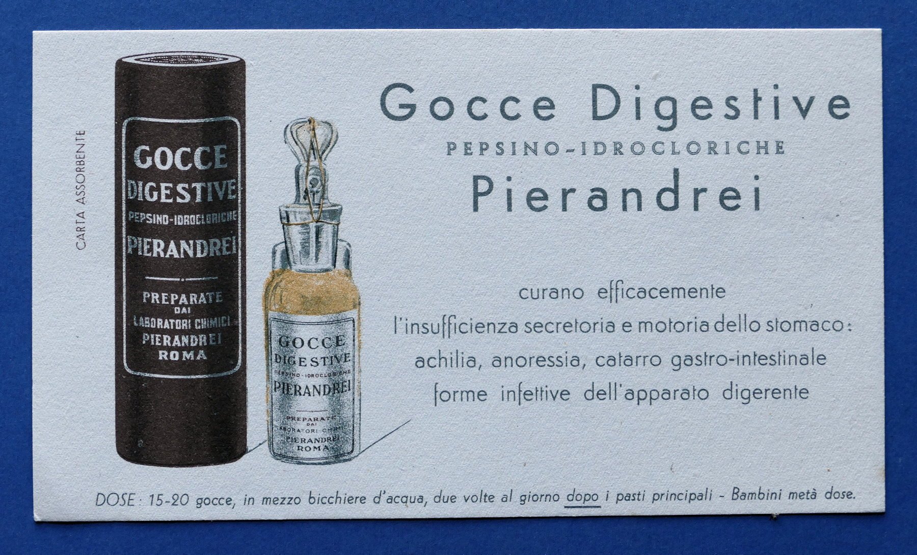 Pubblicità d'epoca Farmaceutica Carta Assorbente - Gocce digestive Pierandrei Dimensioni: 12,5 x 21 cm ca. Condizioni molto buone.