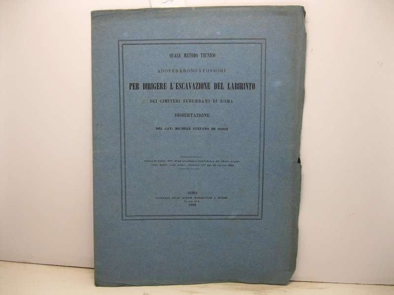 Quale metodo tecnico adoperarono i fossori per dirigere l'escavazione del labirinto dei cimiteri suburbani di Roma. Dissertazione del cav. Michele Stefano De Rossi | Libri antichi e moderni | De Rossi Michele Stefano