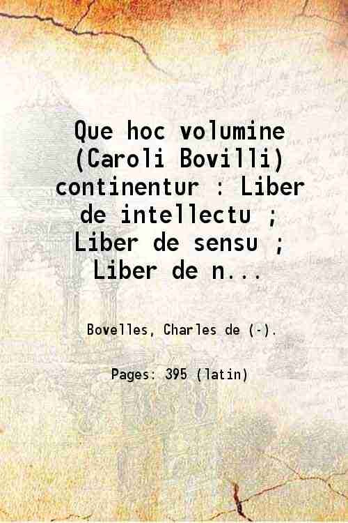 Que hoc volumine (Caroli Bovilli) continentur : Liber de intellectu ; Liber de sensu ; Liber de nichilo ; Ars oppositorum ; Liber de generatione ; Liber de sapiente ; Liber de duodecim numeris ; Epistole complures. Insuper mathematicum opus quadripartitum 1510
