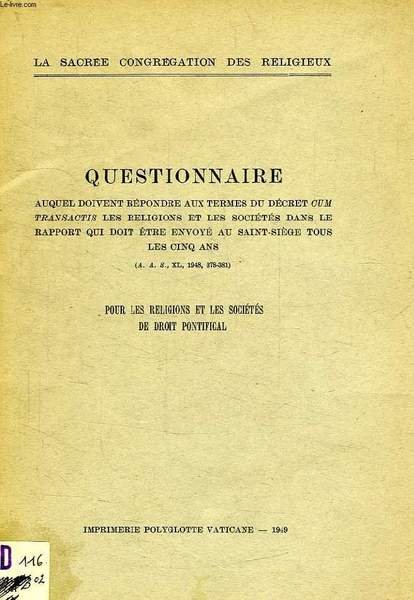 QUESTIONNAIRE AUQUEL DOIVENT REPONDRE AUX TERMES DU DECRET 'CUM TRANSACTIS' LES RELIGIONS ET LES SOCIETES DANS LE RAPPORT QUI DOIT ETRE ENVOYE AU SAINT-SIEGE TOUS LES 5 ANS | Libri antichi e moderni | Collectif