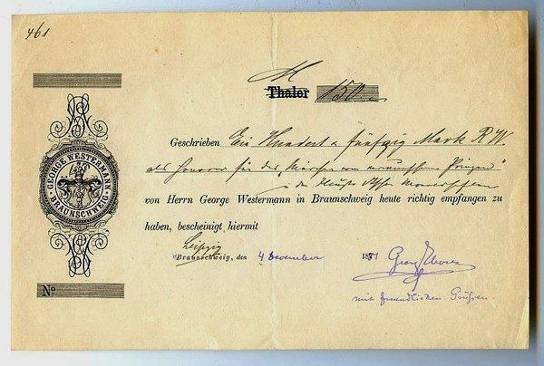 1 S. Qu.-gr.-8vo. Quittiert den Erhalt von 150 Mark für das "Märchen vom verwunschenen Prinzen", das in Westermanns "Illustrierten deutschen Monatsheften" abgedruckt worden war. - Georg Ebers war Professor für Ägyptologe in Leipzig und unternahm 1869/70 und 1872/73 Reisen nach Ägypten, wo er auf letzterer das nach ihm benannte und von ihm edierte medizinische Handbuch "Papyros Ebers" aus der Mitte des 2. Jahrtausends v. Chr. entdeckte. "Eine ägyptische Königstochter" war der erste von Ebers' viel gelesenen historischen Romanen. - Auf Briefpapier mit gedr. Briefkopf des Georg Westermann Verlags; papierbedingt etwas gebräunt.