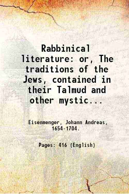 Rabbinical literature: or, The traditions of the Jews, contained in their Talmud and other mystical writings. Likewise the opinions of that people concerning Messiah, and the time and manner of his appearing; with an appendix comprizing Buxtorf's account of the religious customs and ceremonies of that nation; also, A preliminary enquiry into the origin, progress, authority, and usefulness of these traditions; wherein the sense of the strange allegories in the Talmud and Jewish authors is explained. By the Revd. Mr. J.P. Stehelin. Volume 2 1748 | Libri antichi e moderni | Eisenmenger, Johann Andreas