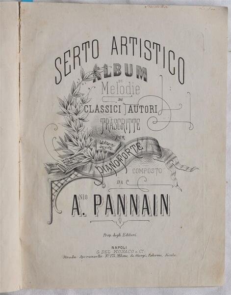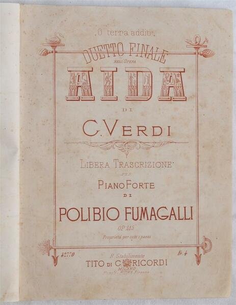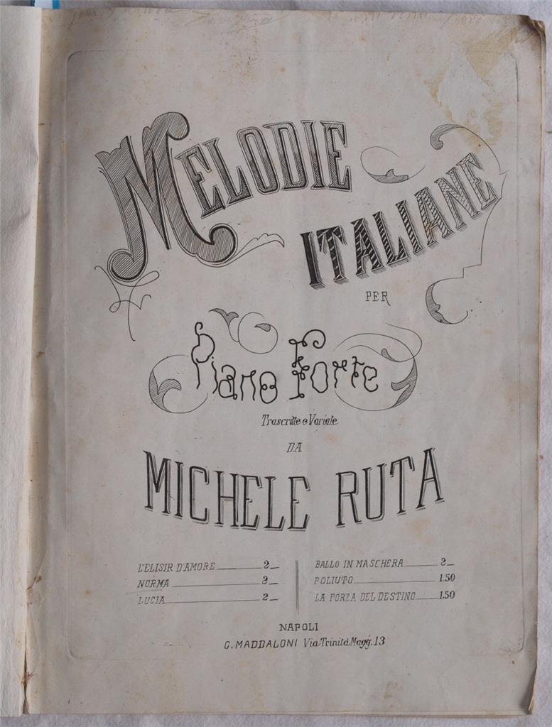 In 4. Dim. 33,5x25 cm. Pp. 130. Bella raccolta di tredici spartiti per pianoforte, la gran parte pubblicati tra il 1880 ed i primi del novecento, rilegati insieme in una copertina morbida ottocentesca.<BR><BR>I compositori sono quasi tutti del XIX secolo, tra i più famosi: Giuseppe Verdi (1813-1901), J. Ascher (1829-1869), Michele Ruta, Carmelina Stanzieri, V. De Meglio.<BR><BR>Tra i pezzi più famosi presenti citiamo: toccatina sul Don Carlos, opera Aida di Verdi, Lucrezia Borgia e Lucia di Donizzetti. <BR><BR> <BR><BR>Belle illustrazioni nelle copertine.<BR><BR> <BR><BR>Alcuni spartiti della Ricordi e riportano timbro a secco della stessa.<BR><BR>Carta spessa.<BR><BR>Antiche note manoscritte su alcune pagine.<BR><BR>Alto valore.<BR><BR> <BR><BR>Elenchiamo gli spartiti presenti:<BR><BR> <BR><BR>- Michele Ruta - Melodie varie per pianoforte - opera Norma di Bellini - Napoli, Maddaloni<BR><BR>- Michele Ruta - Rimembranza delle precauzioni di E. Petrella - Stabilimento Ricordi<BR><BR>- A. Pistilli - Non m'ami più - Napoli, presso del monaco<BR><BR>- A. Pannain - Album di melodie per classici autori (Toccatina sul Don Carlo)- Napoli Del Monaco<BR><BR>- A. Vecchione - Opere per pianoforte (pensiero lugubre di Coop) - Napoli, Federico Girard<BR><BR>- A. Pannain - Album di melodie per classici autori (Alla stella confidente di Robaudi)- Napoli Del Monaco<BR><BR>- M. Ruta - Opere musicali (Fantasia sull'opera Rigoletto di Verdi; una vendetta in domino di Achille Pistilli) - napoli, Tramador<BR><BR>- Joseph Ascher - Sur le lac - milano, Ricordi<BR><BR>- Polibio Fumagalli - duetto finale nell'opera Aida di Verdi - Milano, Ricordi<BR><BR>- J. Ascher - La cascade de roses - Napoli Del Monaco<BR><BR>- V. De Meglio - Fantastico pensiero per pianoforte sull'opera Lucia di Donizzetti - Tito di Giovanni Ricordi<BR><BR>- Divertimento elegante per pianoforte sull'opera Lucrezia Borgia di Donizzetti - Milano, edizioni Ricordi<BR><BR>- Carmelina Stanzieri - Mazurka caratteristica per pianoforte - Napoli, Editori Giannini<BR><BR> <BR><BR>Copertina morbida ottocentesca in buone condizioni generali con lievi usure ai margini, angoli e dorso. Legatura in discrete con rotture. All'interno le pagine si presentano in buone condizioni con fioriture. Beautiful collection of thirteen scores for piano, the greatest part of them published between about 1880 and first years of 1900, bound together in an soft binding. The composers are all of XIX century, among the most famous: Giuseppe Verdi (1813-1901), J. Ascher (1829-1869), Michele Ruta, Carmelina Stanzieri, V. De Meglio Among the most famous pieces we cite: toccatina sul Don Carlos, opera Aida di Verdi, Lucrezia Borgia e Lucia di Donizzetti etc. Some scores have been published by Ricordi and they have the embossed stamp of it. Wide paper Ancient manuscripted notes in some pages.<BR><BR>High value.<BR><BR> <BR><BR>Here listed the scores:<BR><BR> <BR><BR>-Michele Ruta - Melodie varie per pianoforte - opera Norma di Bellini - Napoli, Maddaloni<BR><BR>- Michele Ruta - Rimembranza delle precauzioni di E. Petrella - Stabilimento Ricordi<BR><BR>- A. Pistilli - Non m'ami più - Napoli, presso del monaco<BR><BR>- A. Pannain - Album di melodie per classici autori (Toccatina sul Don Carlo)- Napoli Del Monaco<BR><BR>- A. Vecchione - Opere per pianoforte (pensiero lugubre di Coop) - Napoli, Federico Girard<BR><BR>- A. Pannain - Album di melodie per classici autori (Alla stella confidente di Robaudi)- Napoli Del Monaco<BR><BR>- M. Ruta - Opere musicali (Fantasia sull'opera Rigoletto di Verdi; una vendetta in domino di Achille Pistilli) - napoli, Tramador<BR><BR>- Joseph Ascher - Sur le lac - milano, Ricordi<BR><BR>- Polibio Fumagalli - duetto finale nell'opera Aida di Verdi - Milano, Ricordi<BR><BR>- J. Ascher - La cascade de roses - Napoli Del Monaco<BR><BR>- V. De Meglio - Fantastico pensiero per pianoforte sull'opera Lucia di Donizzetti - Tito di Giovanni Ricordi<BR><BR>- Divertimento elegante per pianoforte sull'opera Lucrezia Borgia di Donizzetti - Milano, edizioni Ricordi<BR><BR>- Carmelina Stanzieri - Mazurka caratteristica per pianoforte - Napoli, Editori Giannini Soft cover in good general conditions slightly worn in the edges, spine and corners. Binding in fair conditions with slight cracks. Inside pages are in good conditions with foxings.