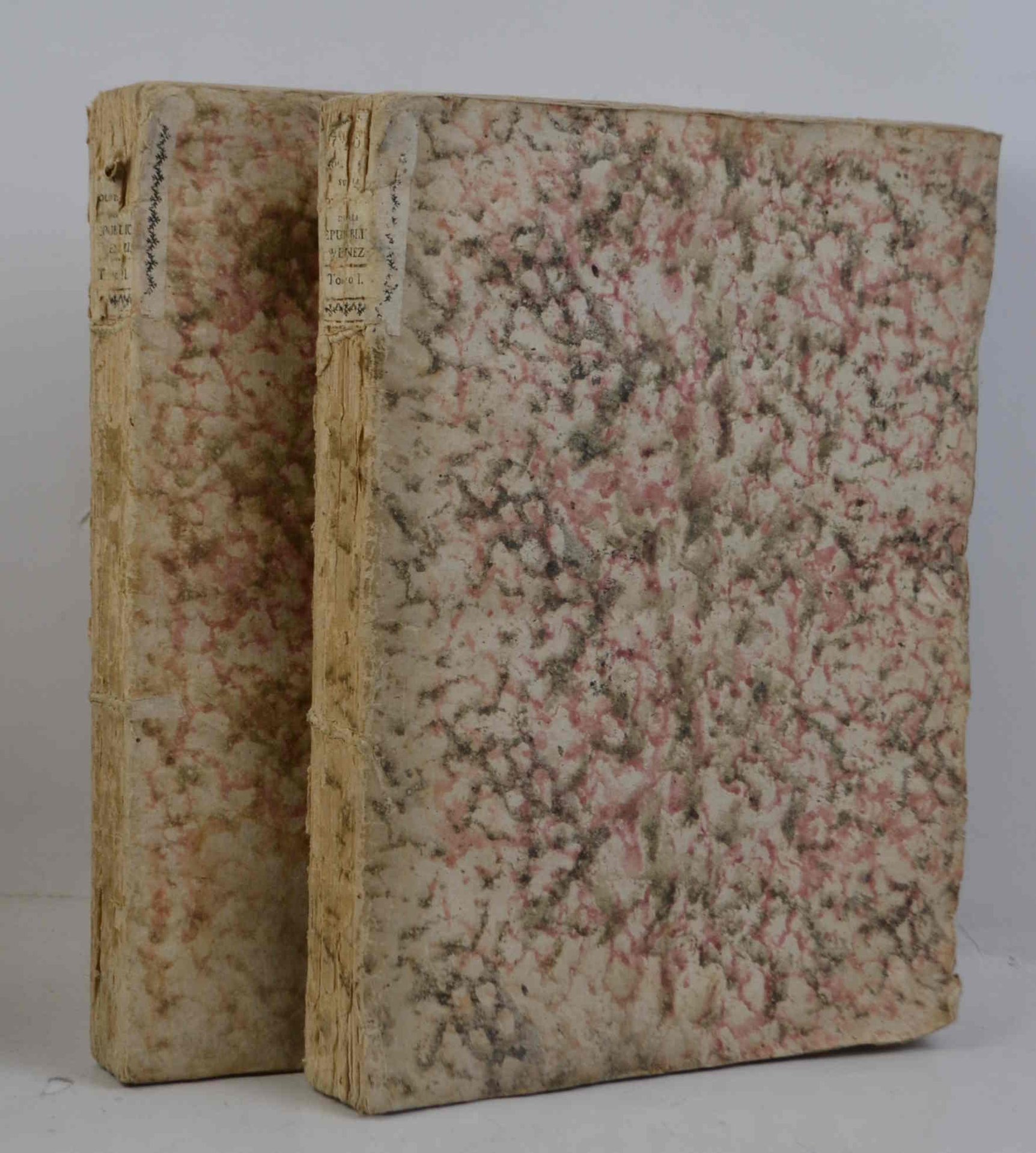 Due volumi di cm. 25, pp. 288; 308. Graziosa legatura coeva in cartoncino marmorizzato con titoli a stampa su etichette ai dorsi. Piccole mancanze superficiali ai dosi, peraltro esemplare genuino ed in buono stato di conservazione. Ex libris. Una nota coeva manoscritta recita: "Il possesso di questa raccolta era dai francesi punita con la decapitazione".